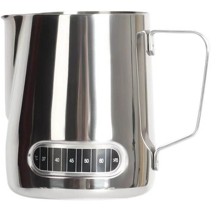 مقياس حرارة مدمج: يسمح بمراقبة دقيقة لدرجة الحرارة، مما يضمن رغوة الحليب إلى درجة الحرارة المثالية (عادةً حوالي 65 درجة مئوية أو 150 درجة فهرنهايت).
